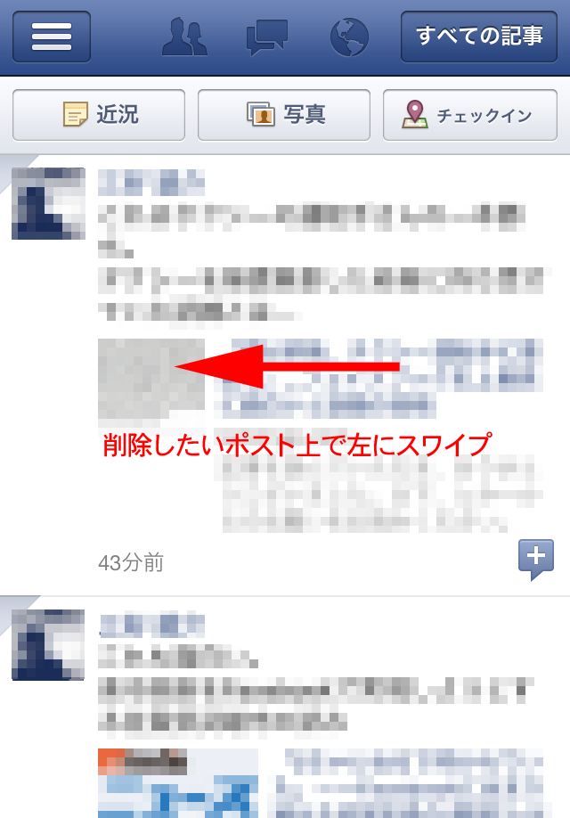 ニュースフィード上の削除したい自分の投稿の上で左にスワイプ